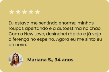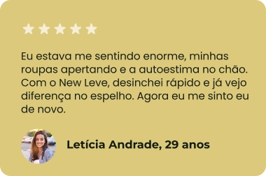 Use o New Leve todos os dias. Se você não sentir redução de fome, menos ansiedade, menos inchaço e mais leveza nas primeiras semanas, devolvemos 100% do seu dinheiro.